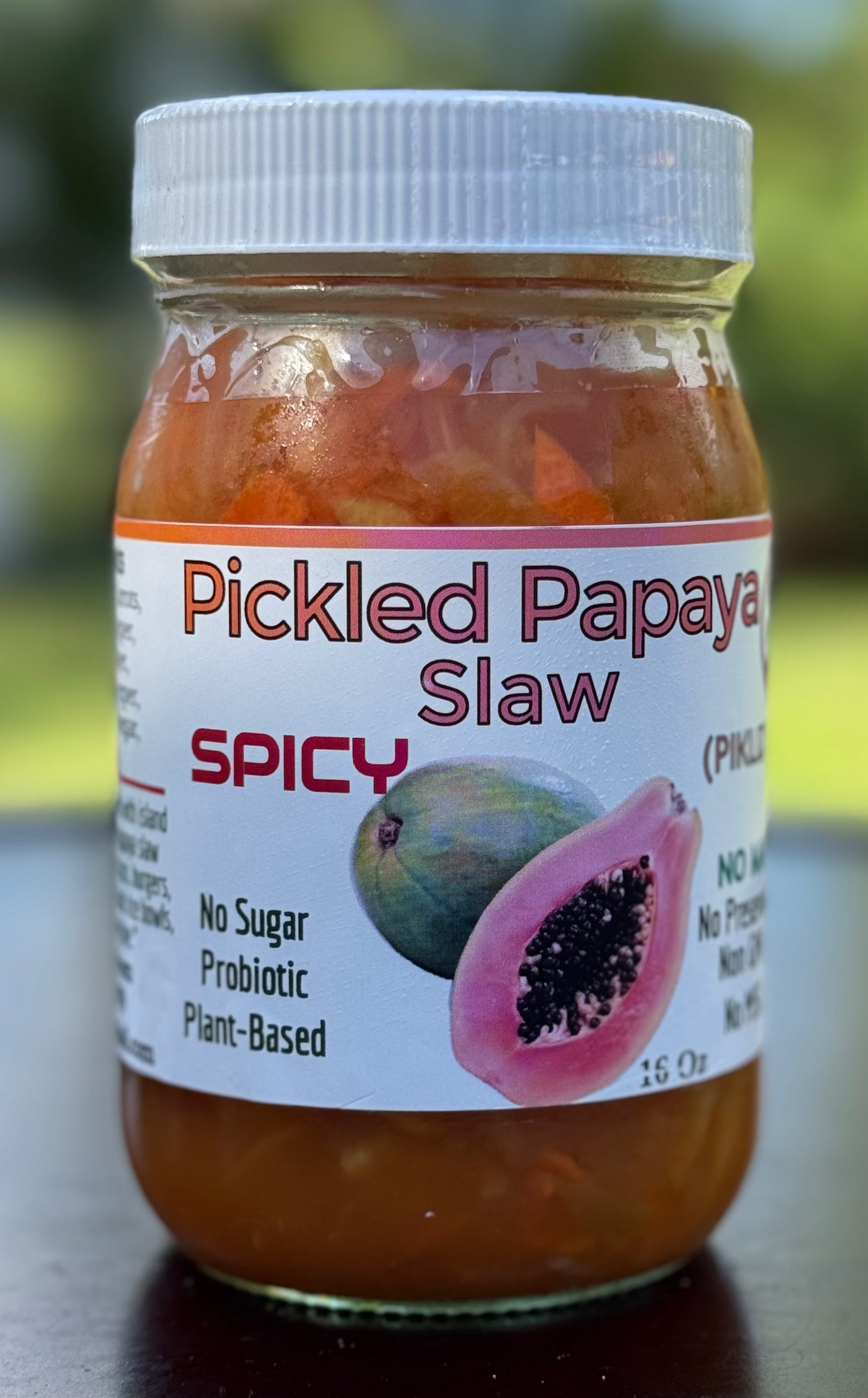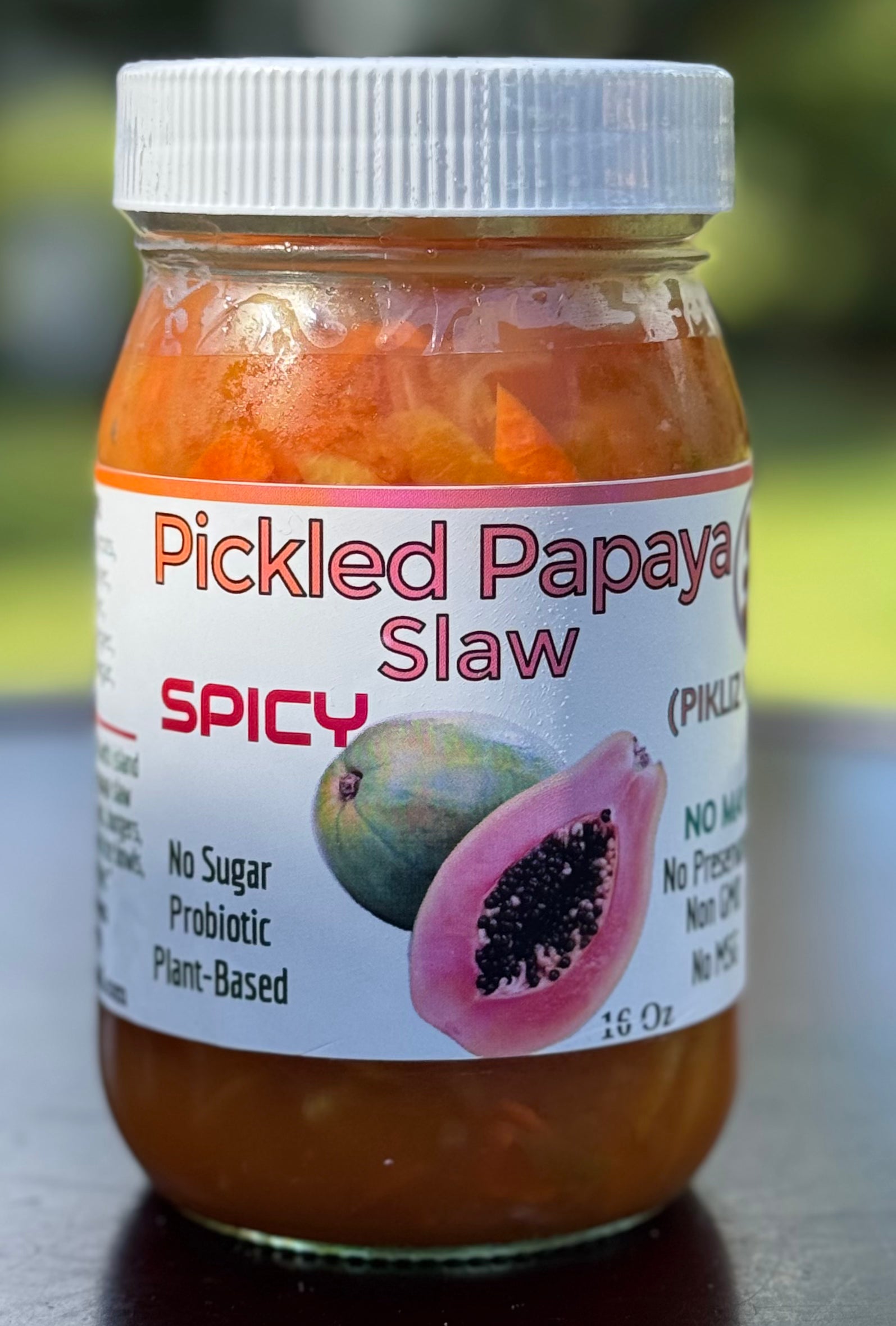 Fresh, crisp, and boldly tangy, our Spicy Pickled Papaya Slaw blends semi-ripe papaya, carrots, onions, garlic, and spices in a vibrant vinegar-lime brine. No sugar added, with a fiery island kick.